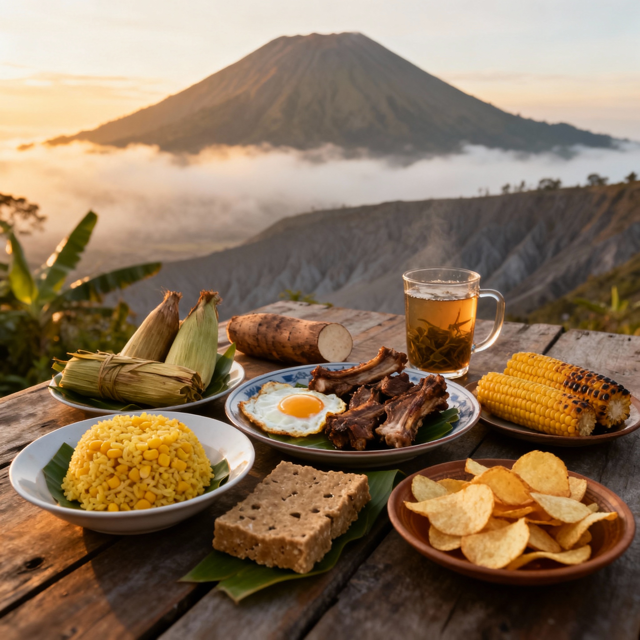 Jagung bakar sudah jadi ikon kuliner di Penanjakan dan sekitar view point sunrise Bromo. Aroma bakaran dan variasi rasa asin, manis, keju atau pedas langsung menghangatkan tubuh. Tidak ketinggalan keripik kentang khas Bromo—berasal dari kentang putih lokal Sukapura, Probolinggo—yang renyah dan cocok dibawa sebagai oleh-oleh sepulang dari Bromo.