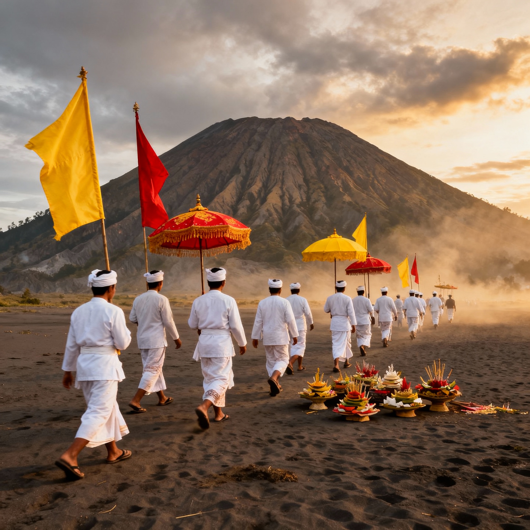 Hingga hari ini, peristiwa pengorbanan tersebut diperingati dan diwariskan lewat tradisi besar: Yadnya Kasada. Setiap tahun, masyarakat Tengger mengarak hasil bumi, hewan ternak, dan berbagai sesaji ke Pura Luhur Poten di kaki Bromo. Ritual ini menjadi prosesi sakral: ratusan warga berjalan kaki menembus kabut dan pasir di dini hari, membaurkan doa, rasa syukur, serta harapan pada kemurahan Tuhan dan berkat leluhur.